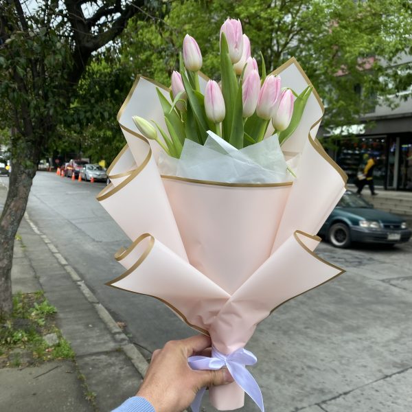 $29.990Este hermoso arreglo floral es el regalo perfecto para agregar un toque de elegancia a cualquier ocasión especial. Con 10 tulipanes, este ramo irradia pureza y gracia en cada pétalo Envuelto en papel coreano rosado claro con borde dorado, este ramo tiene un toque premium que lo hace destacar.