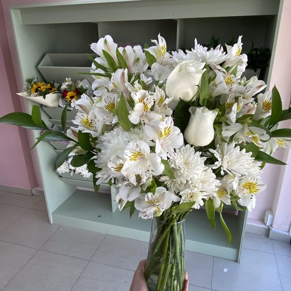 $55.990El precio original era: $55.990.$48.990El precio actual es: $48.990.Elegante florero con más de 20 varas de astromelias, 6 varas de maule blanco y 2 rosas blancas en base de vidrio. Un arreglo moderno y sereno para expresar condolencias con respeto y cariño. Disponible para envío de flores de pésame en Concepción o Santiago con Tulip. (Florero + Arreglo).