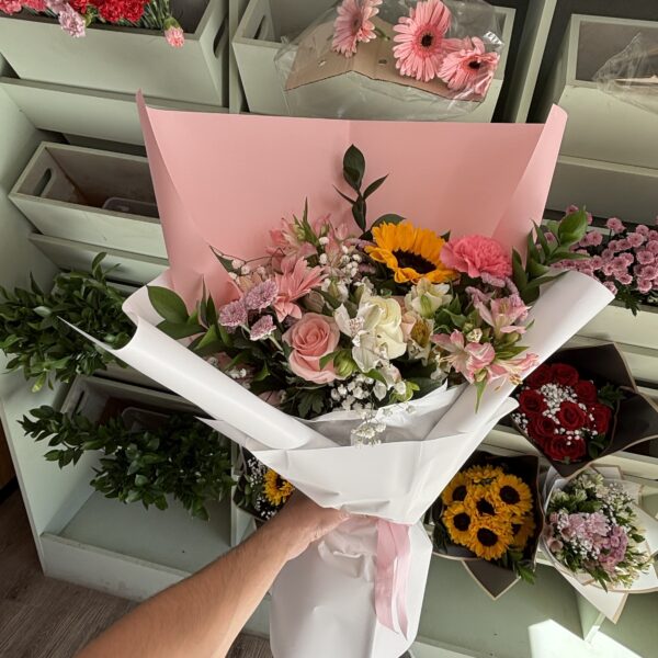$39.990El precio original era: $39.990.$29.990El precio actual es: $29.990.El Ramo Garden es una composición fresca y luminosa de flores mixtas cuidadosamente seleccionadas. Combina astromelias, rosas, girasol, clavel, ilusión y gerbera, acompañadas de follaje de temporada. Su envoltorio en papel coreano blanco y rosado, con cinta blanca, crea un diseño minimalista, delicado y lleno de vida.