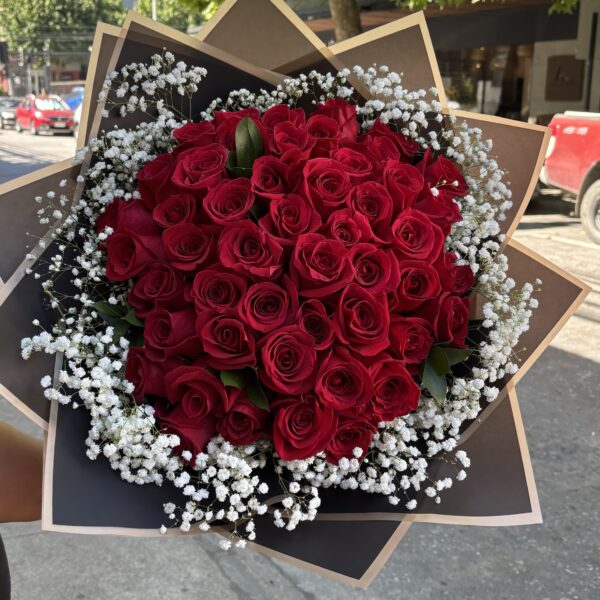 $59.990 - $98.990Rango de precios: desde $59.990 hasta $98.990Un elegante ramo de 25 o 50 rosas rojas, acompañado de delicadas flores ilusión en el contorno y envuelto en sofisticado papel coreano negro. Un diseño intenso, romántico y moderno, perfecto para expresar amor, pasión o una ocasión realmente especial.