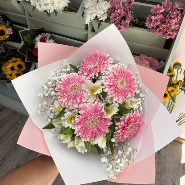 $34.990El precio original era: $34.990.$24.990El precio actual es: $24.990.Delicado y luminoso ramo compuesto por 5 gerberas, 3 varas de astromelia, ilusión y maule blanco, envuelto en papel coreano rosado pastel y blanco. Un diseño minimalista, fresco y armonioso, perfecto para regalar alegría, cariño y ternura en cualquier ocasión especial.