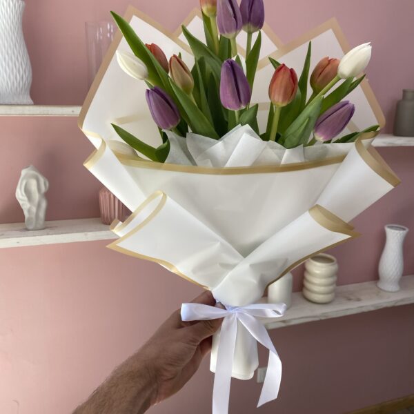 $45.990El precio original era: $45.990.$35.990El precio actual es: $35.990.Ramo con 2 rosas blancas, 2 rosas rosadas, 5 tulipanes, maule morado, ilusión, palmilla y follaje de temporada. Envuelto en papel blanco con bordes dorados, transmite elegancia, frescura y un mensaje lleno de sentimientos.