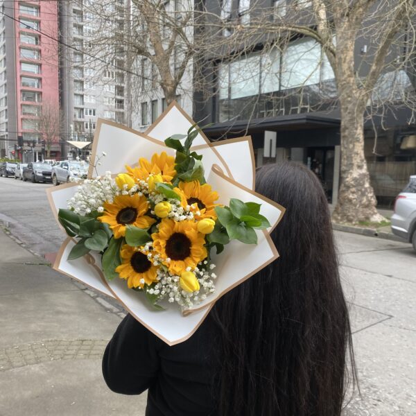 $45.990El precio original era: $45.990.$35.990El precio actual es: $35.990.Ramo de 5 girasoles y 5 tulipanes amarillos, acompañados de ilusión y follaje de temporada. Presentado en elegante papel coreano blanco con bordes dorados, ideal para transmitir alegría, energía y luz en cada ocasión.