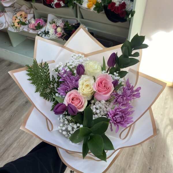 $45.990El precio original era: $45.990.$35.990El precio actual es: $35.990.Ramo con 2 rosas blancas, 2 rosas rosadas, 5 tulipanes, maule morado, ilusión, palmilla y follaje de temporada. Envuelto en papel blanco con bordes dorados, transmite elegancia, frescura y un mensaje lleno de sentimientos.