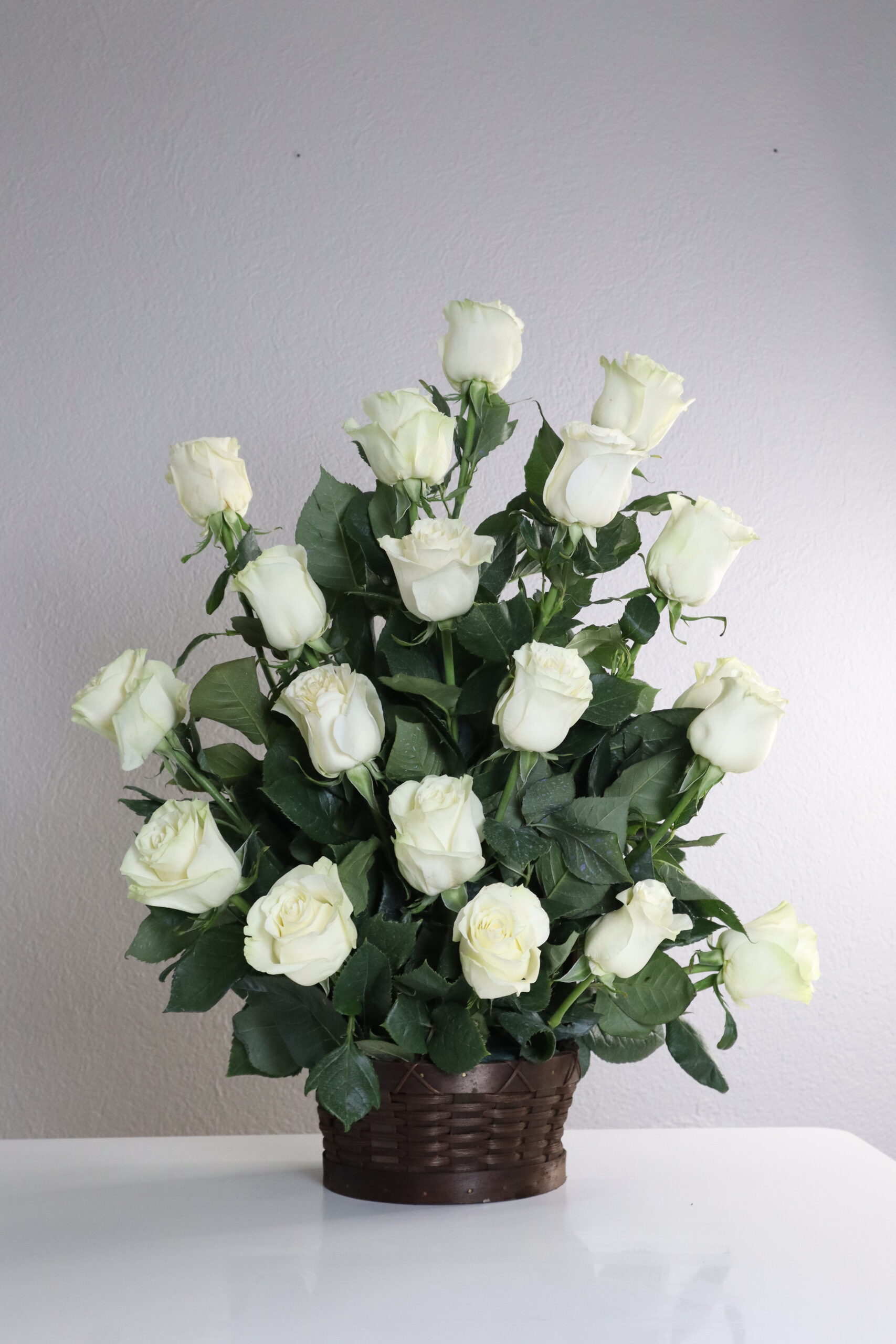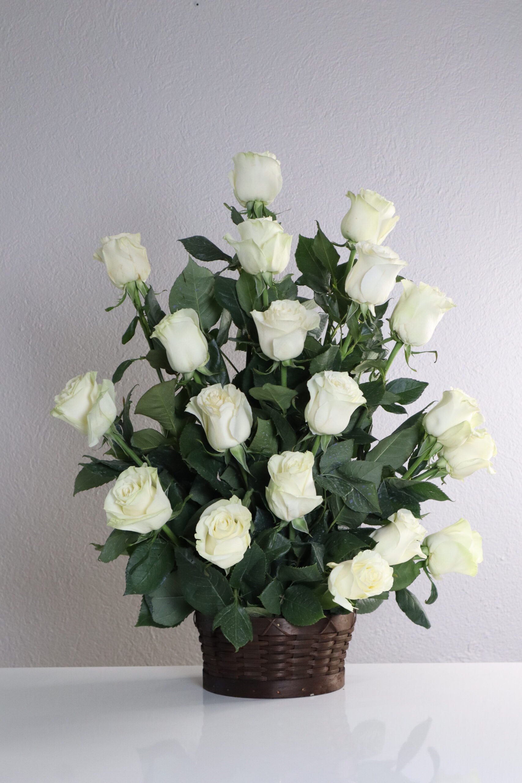 Este emotivo arreglo floral está compuesto por 24 o 48 rosas blancas, símbolo de pureza y paz, cuidadosamente dispuestas en una delicada canasta tejida. Cada rosa se presenta con elegancia, acompañada de follaje de temporada que añade un toque de serenidad y calidez al conjunto.