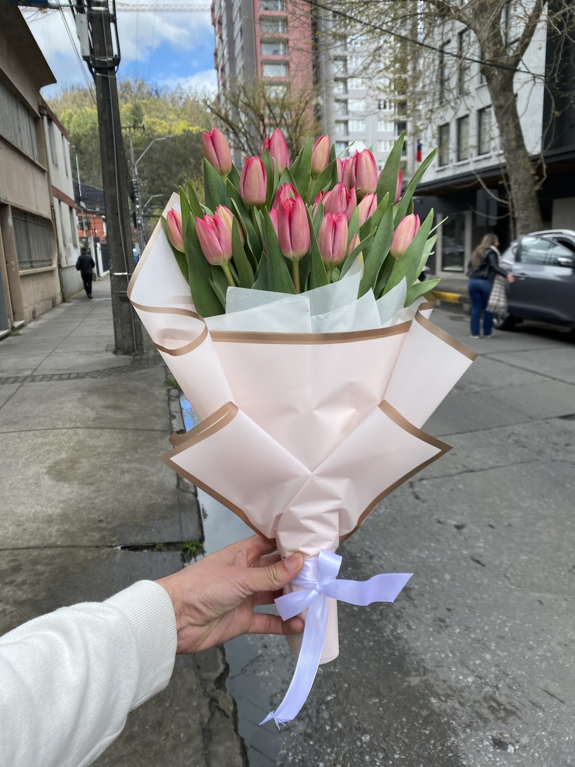 Precioso ramo de 20 tulipanes de color Rosados, envueltos en papel coreano color rosa, con estilo japonés. Es el regalo perfecto para cualquier ocasión.