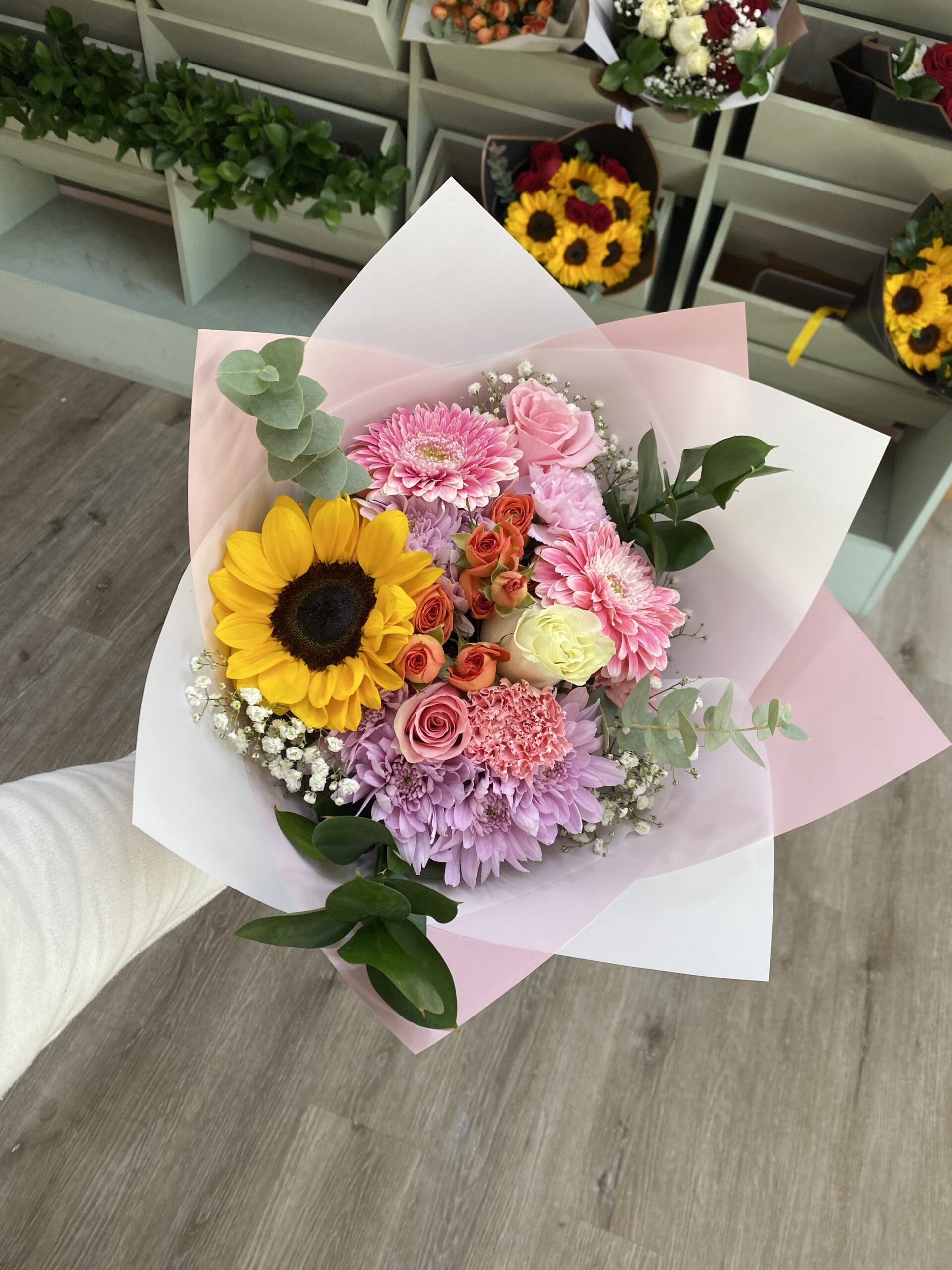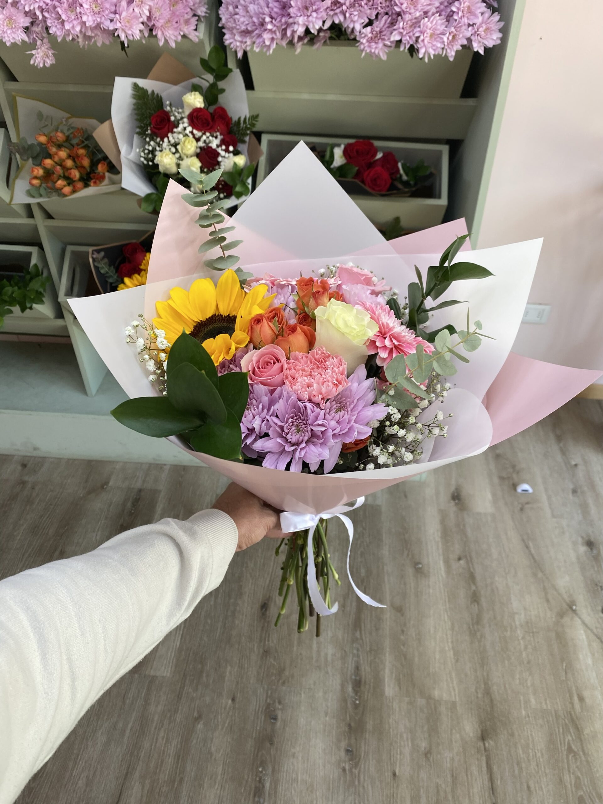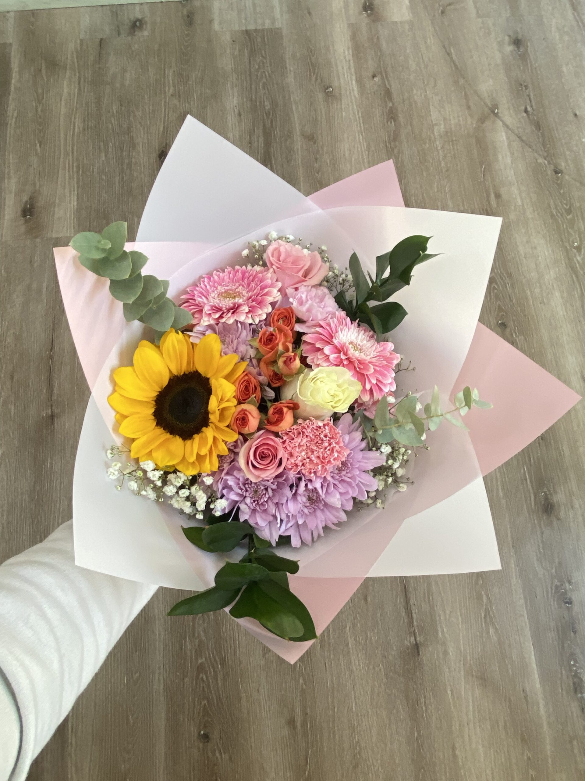 Hermoso ramo con una variada combinación rosas rosadas, rosa blanca, claveles, maule, mini rosas, gerberas y un girasol, acompañado de follaje de temporada e ilusión para destacar la elegancia y belleza de este ramo.