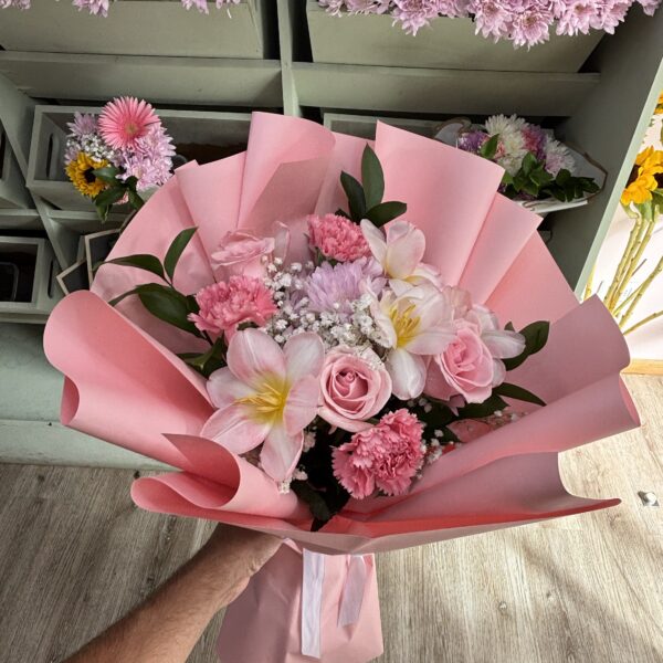 Su presentación destaca por un envoltorio en papel coreano rosado claro, con un acabado minimalista que realza la elegancia y modernidad del arreglo. Es un ramo visualmente delicado pero con presencia, ideal para regalos significativos, celebraciones especiales o sorprender con un detalle sofisticado.