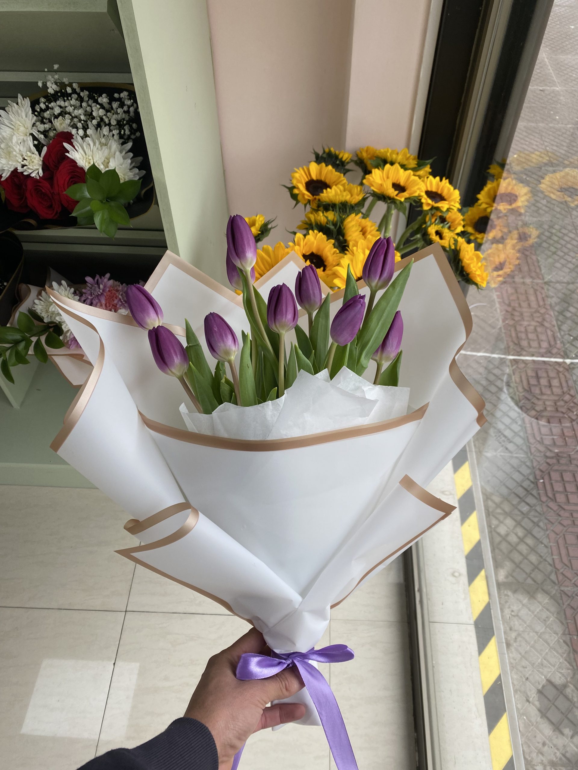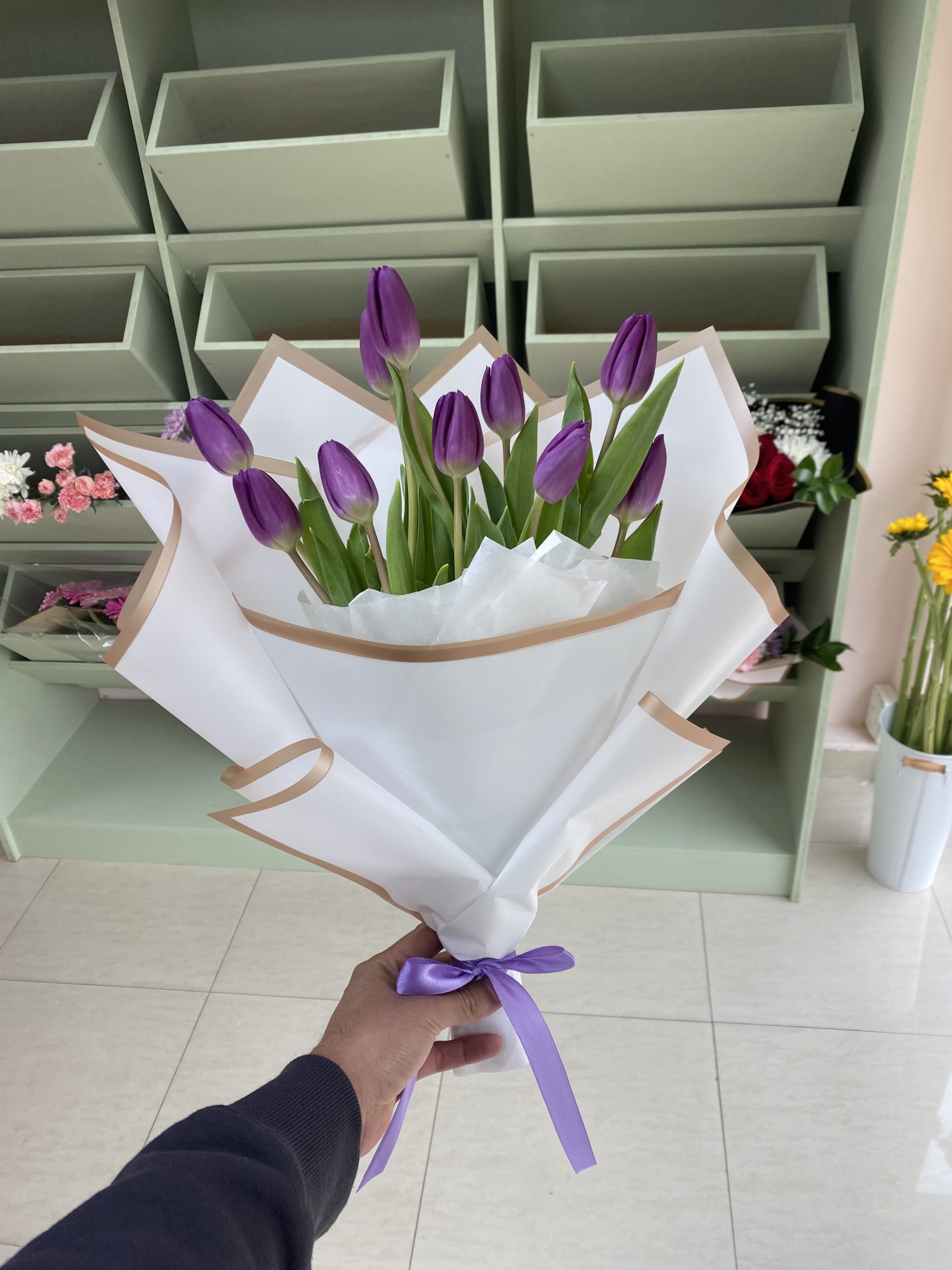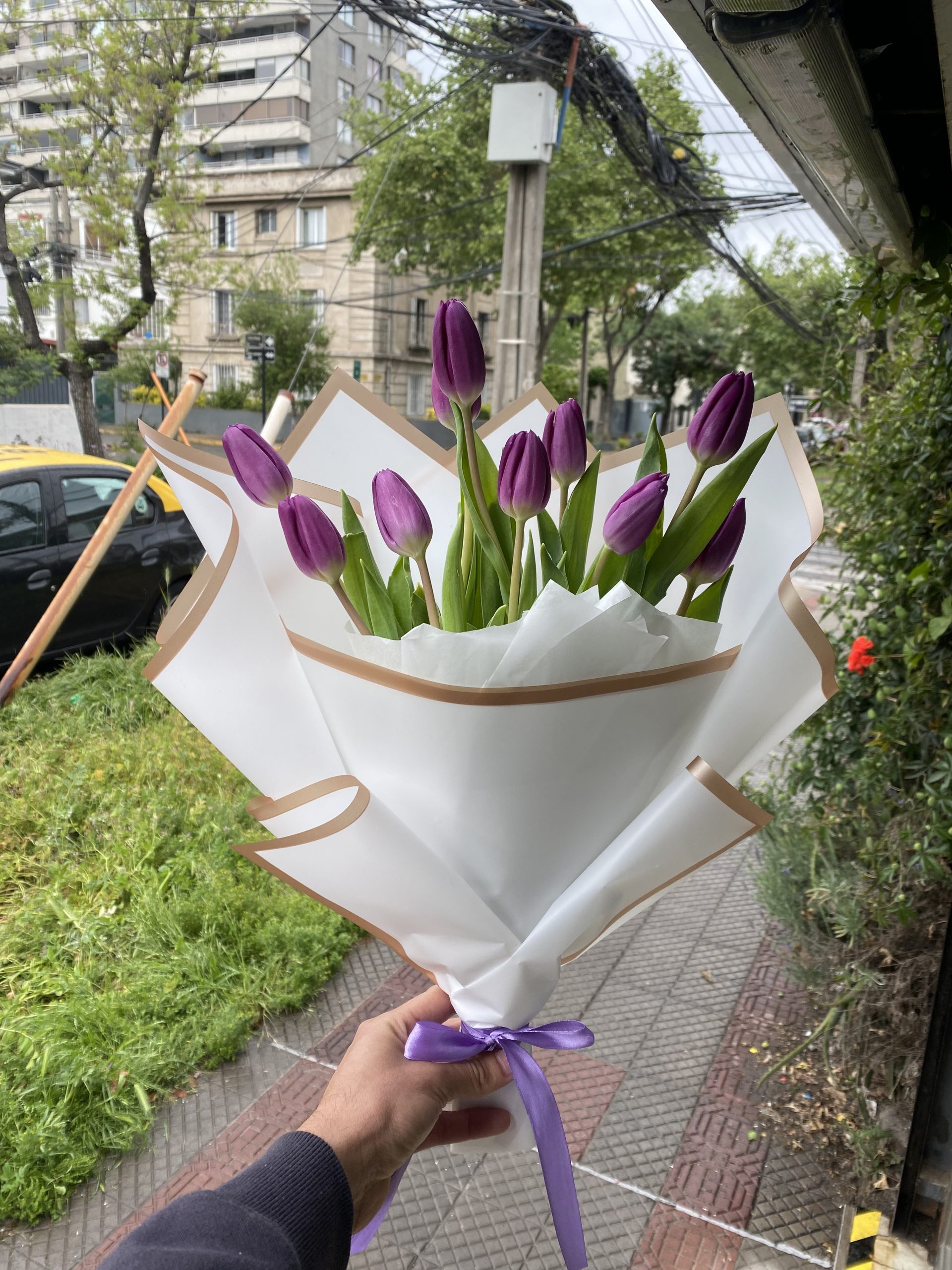 Precioso ramo de 10 tulipanes de color lila, envueltos en papel, con estilo coreano. Es el regalo perfecto para cualquier ocasión.