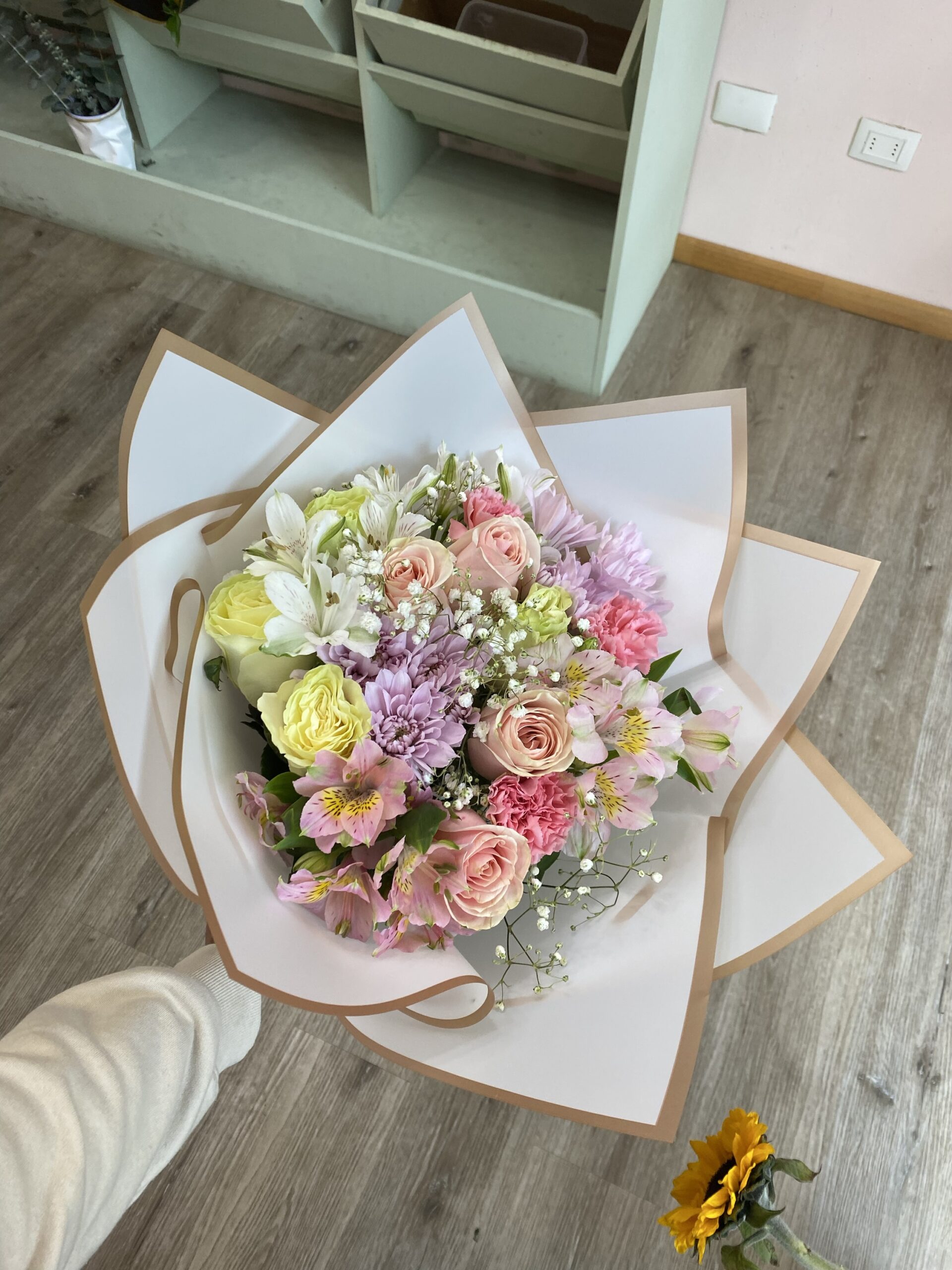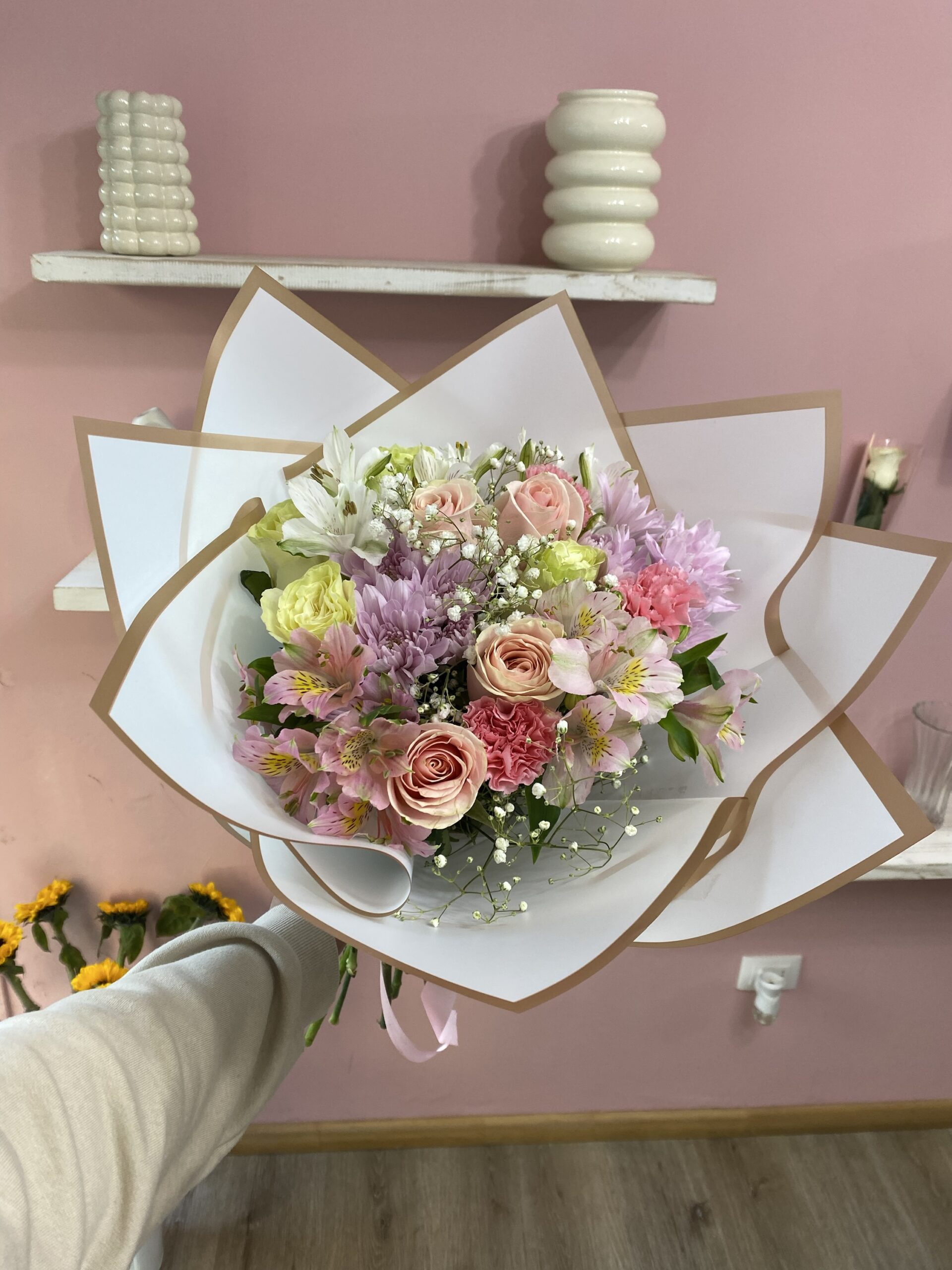 Un ramo elegante y lleno de vida, con rosas, astromelias, claveles y maule en tonos rosados y blancos, cuidadosamente envuelto en papel coreano blanco con bordes dorados. Ideal para regalar amor, gratitud o alegría con estilo.