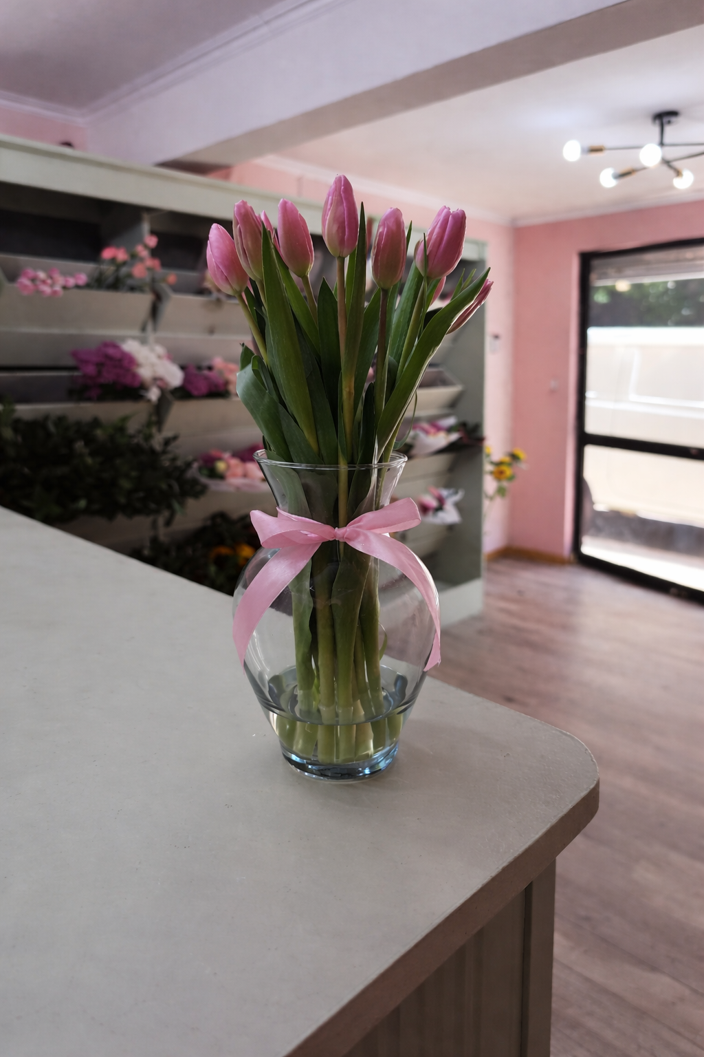 Este cautivador arreglo floral es el regalo perfecto para sorprender y deleitar a tus seres queridos en cualquier ocasión especial. Con 10 tulipanes en una tonos rosados, este conjunto transmite alegría y amor en cada pétalo, todo en un hermoso florero de vidrio.