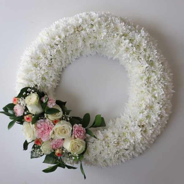 $95.990El precio original era: $95.990.$85.990El precio actual es: $85.990.Nuestra corona de 58 cm, con más de 170 flores de maule y 6 rosas blancas y flores mixtas en tonos rosados, ofrece un homenaje solemne y elegante para funerales. Diseñada con follaje de temporada, expresa paz y cariño en momentos difíciles.