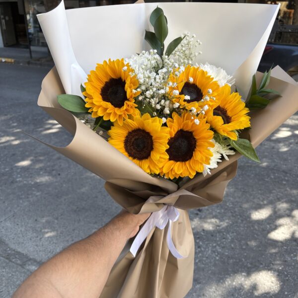 Con seis girasoles radiantes y follaje de temporada, este encantador arreglo floral ilumina cualquier espacio con su energía positiva y su estilo llamativo.