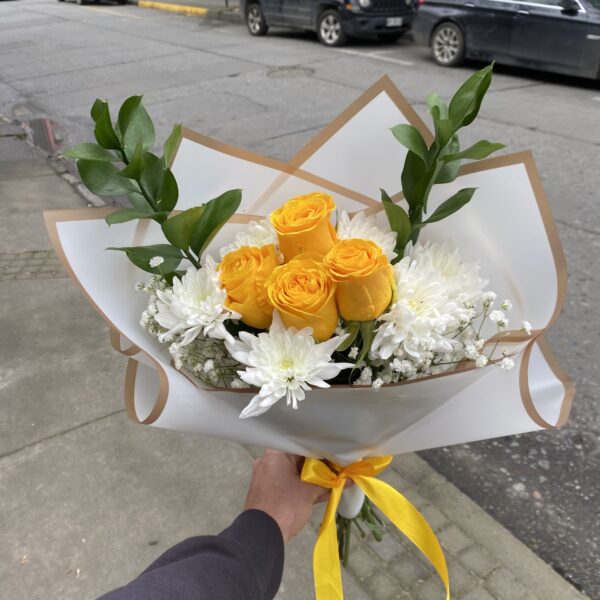 $32.990El precio original era: $32.990.$22.990El precio actual es: $22.990.Ramo con 4 rosas amarillas, maule amarillo y blanco, ilusión y follaje de temporada, envuelto en papel blanco con bordes dorados y cinta amarilla. Ideal para todo tipo de ocasiones o para las fechas de flores amarillas.
