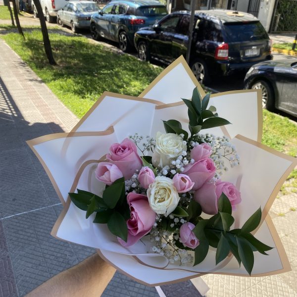 $32.990El precio original era: $32.990.$23.990El precio actual es: $23.990.Un delicado ramo en tonos rosados con rosas, astromelias y maule, acompañado de ilusión y eucalipto. Envuelto en papel coreano blanco con bordes dorados, elegante y encantador.